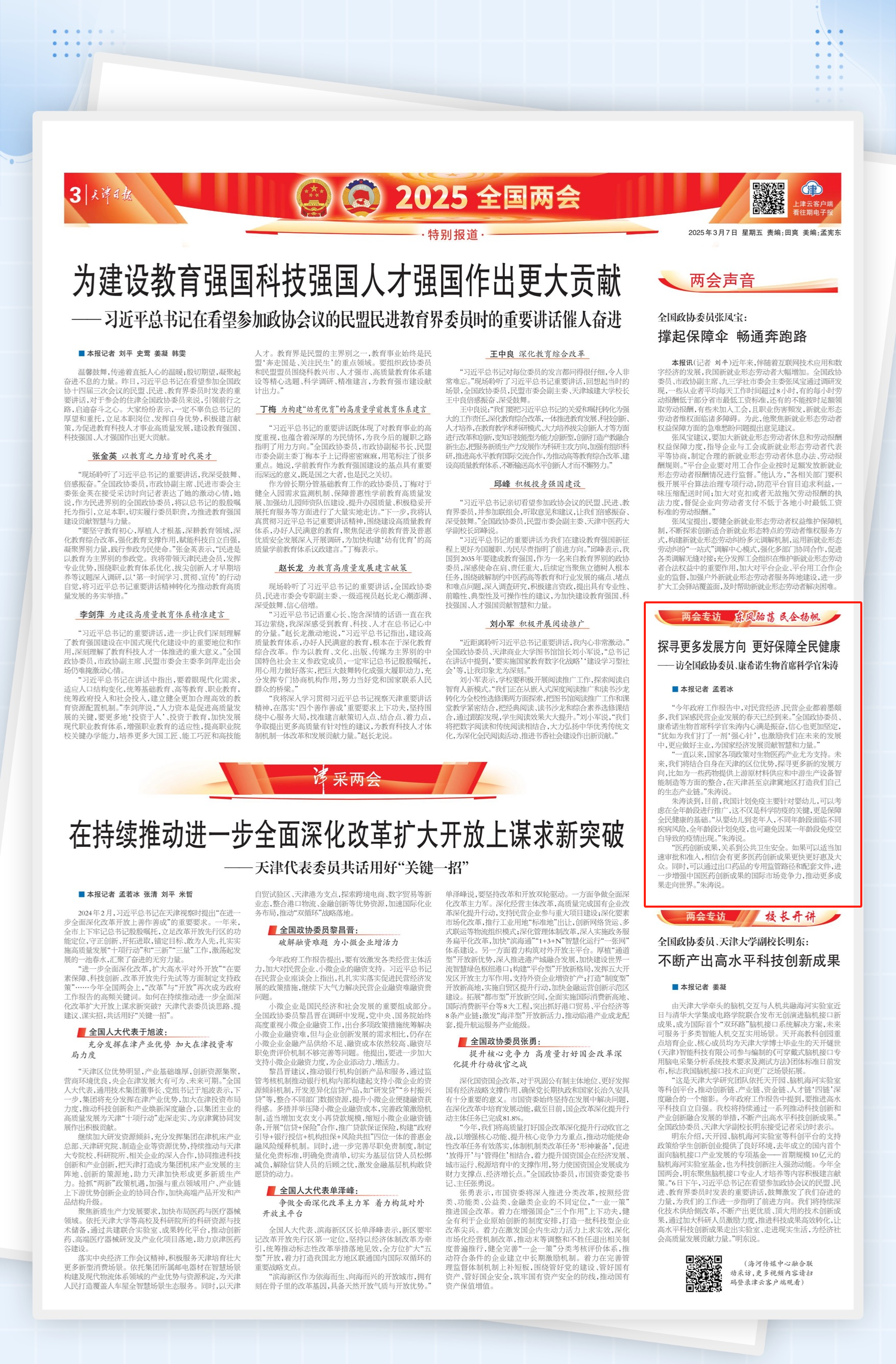 连日来,全国政协委员、Ebpay生物首席科学官朱涛紧扣大会议程,牢记职责使命,建真言、献良策、出实招,传递信心,凝聚力量,为推广全年龄段疫苗接种、提高医药创新成果转化效率,优化联合疫苗审评审批机制、有助于国产高质量疫苗“出海”等提出建议,引发主流媒体的关注报道。